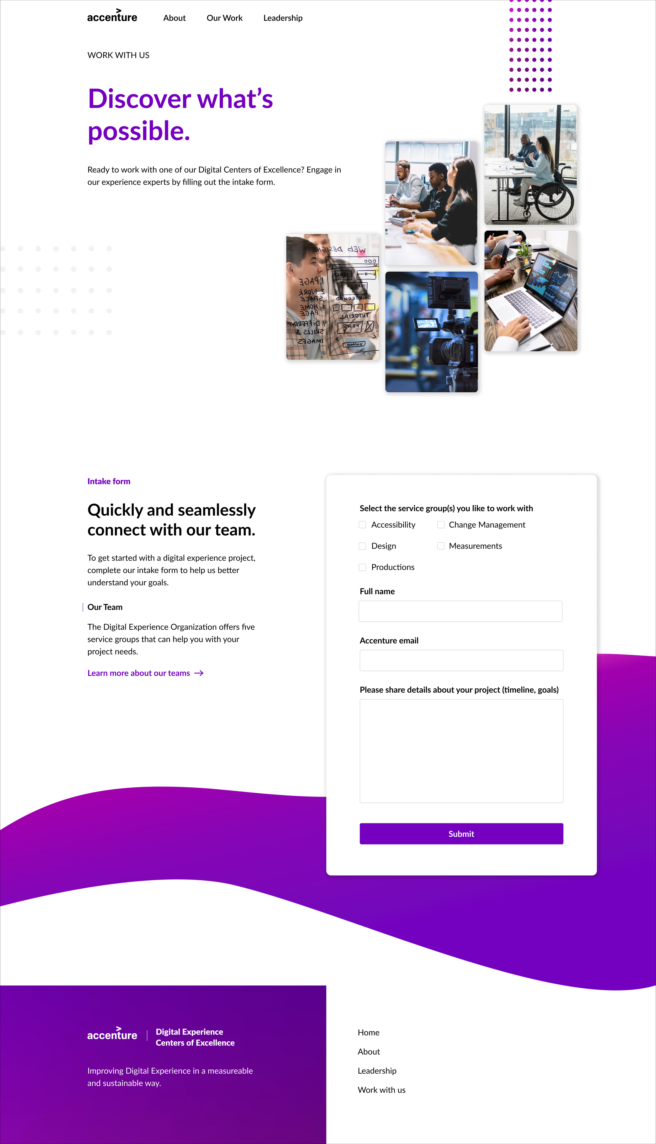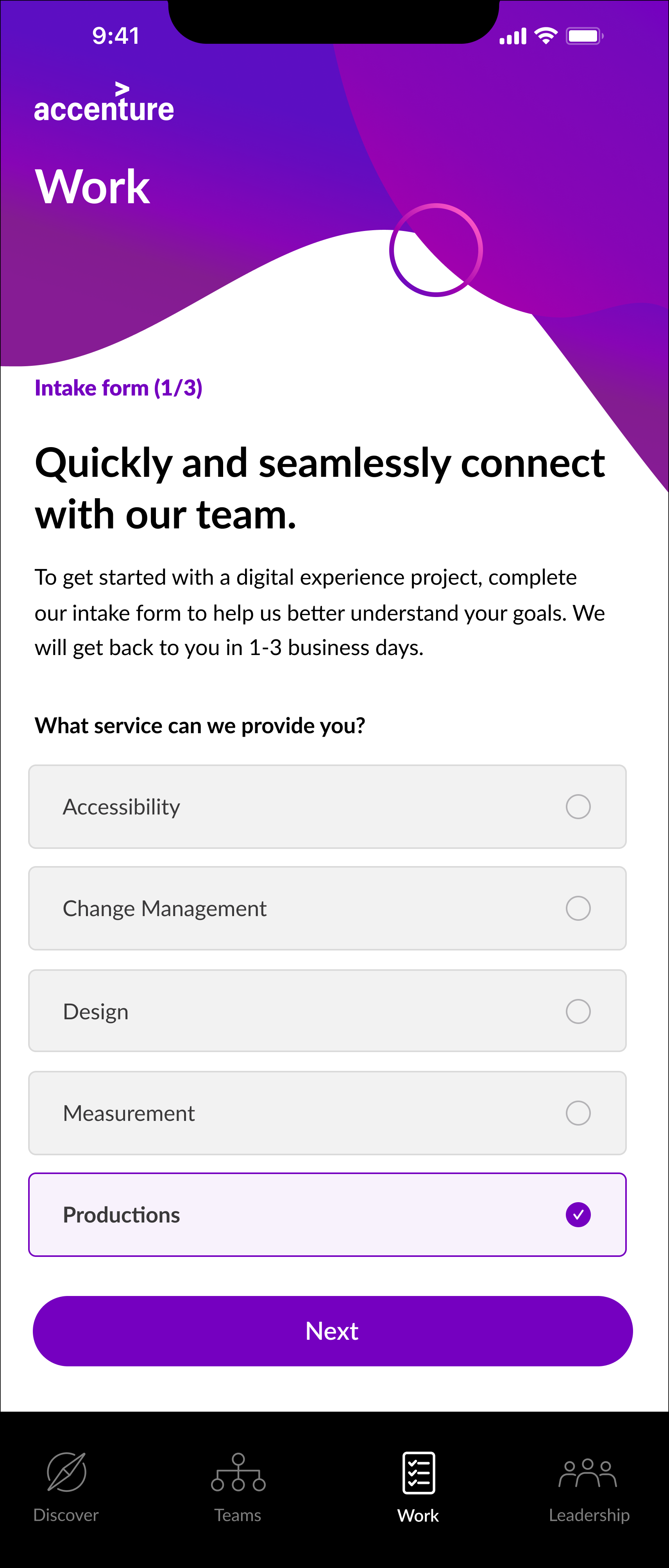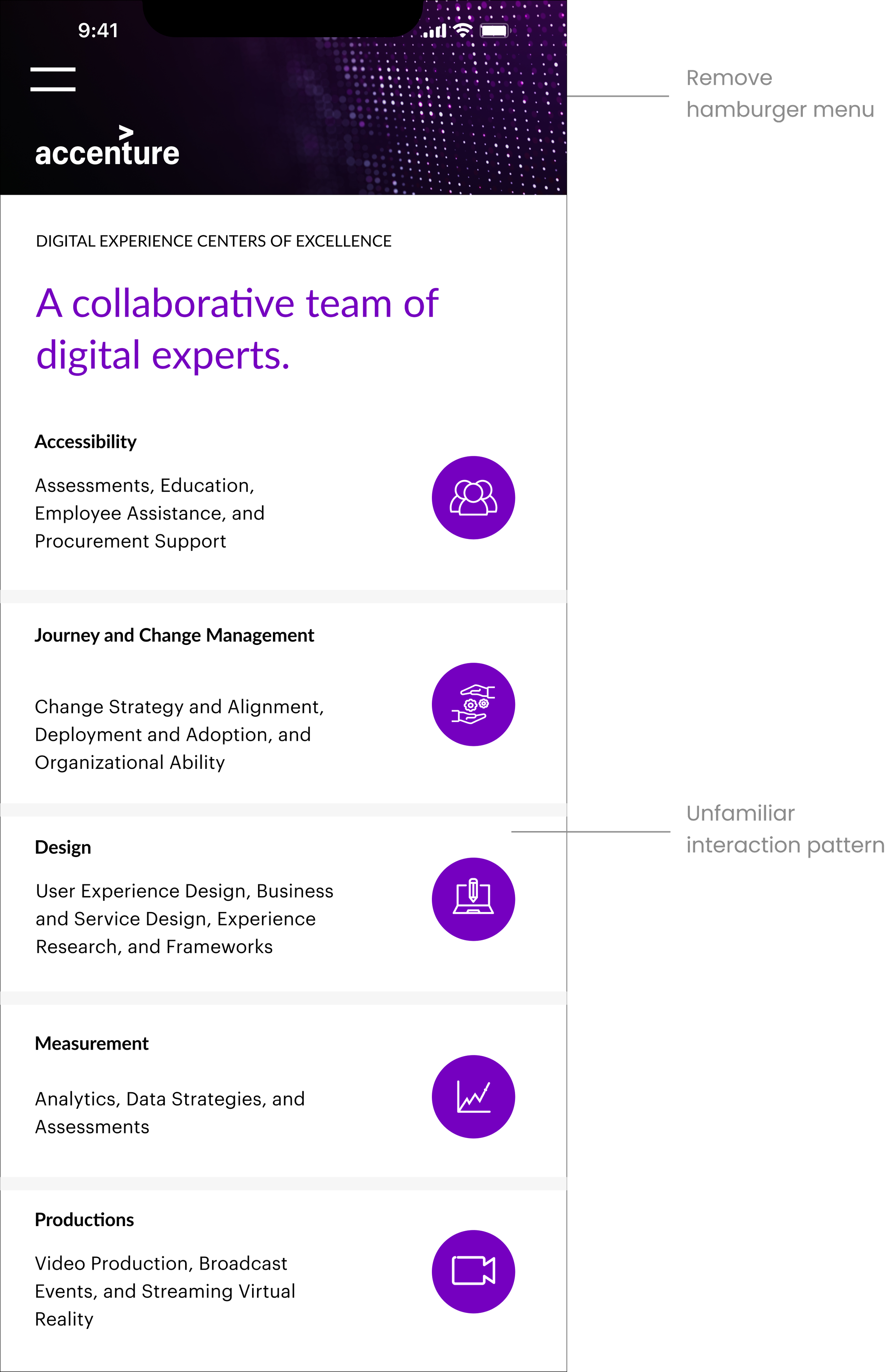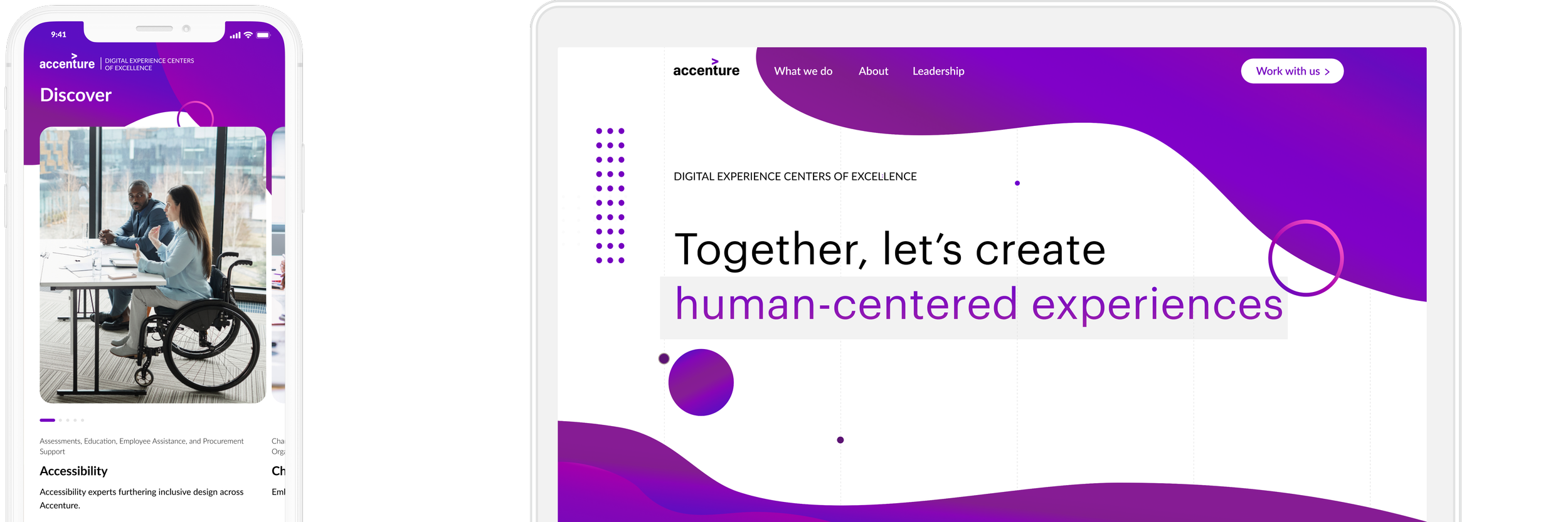 This project aimed to design a website and mobile app that reinforces Accenture Digital Experience Organization’s identity as a unified entity, rather than a collection of separate teams. The primary goals were to increase engagement and establish a cohesive brand for the organization. One design challenge was translating web designs into a mobile app.