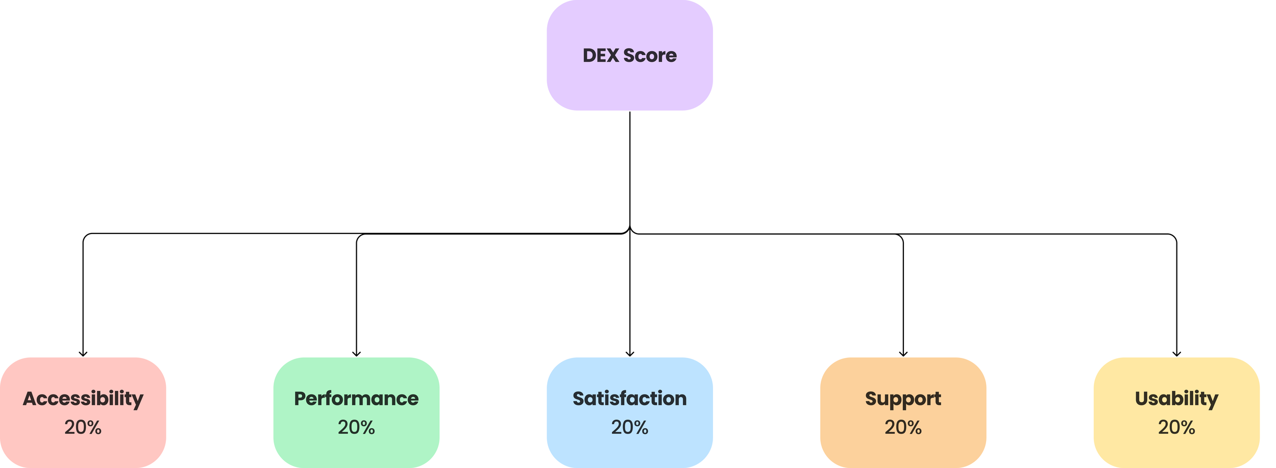 The DEX platform contains a Product Experience Score (DEX Score), which is a metric used to evaluate the quality of digital applications used by Accenture employees. It’s composed of five key subcategories. Each of these application are given a DEX score between 1-5. If an app scores below a 4, users can utilize the DEX platform to analyze and identify improvement opportunities and pain points causing a low score.