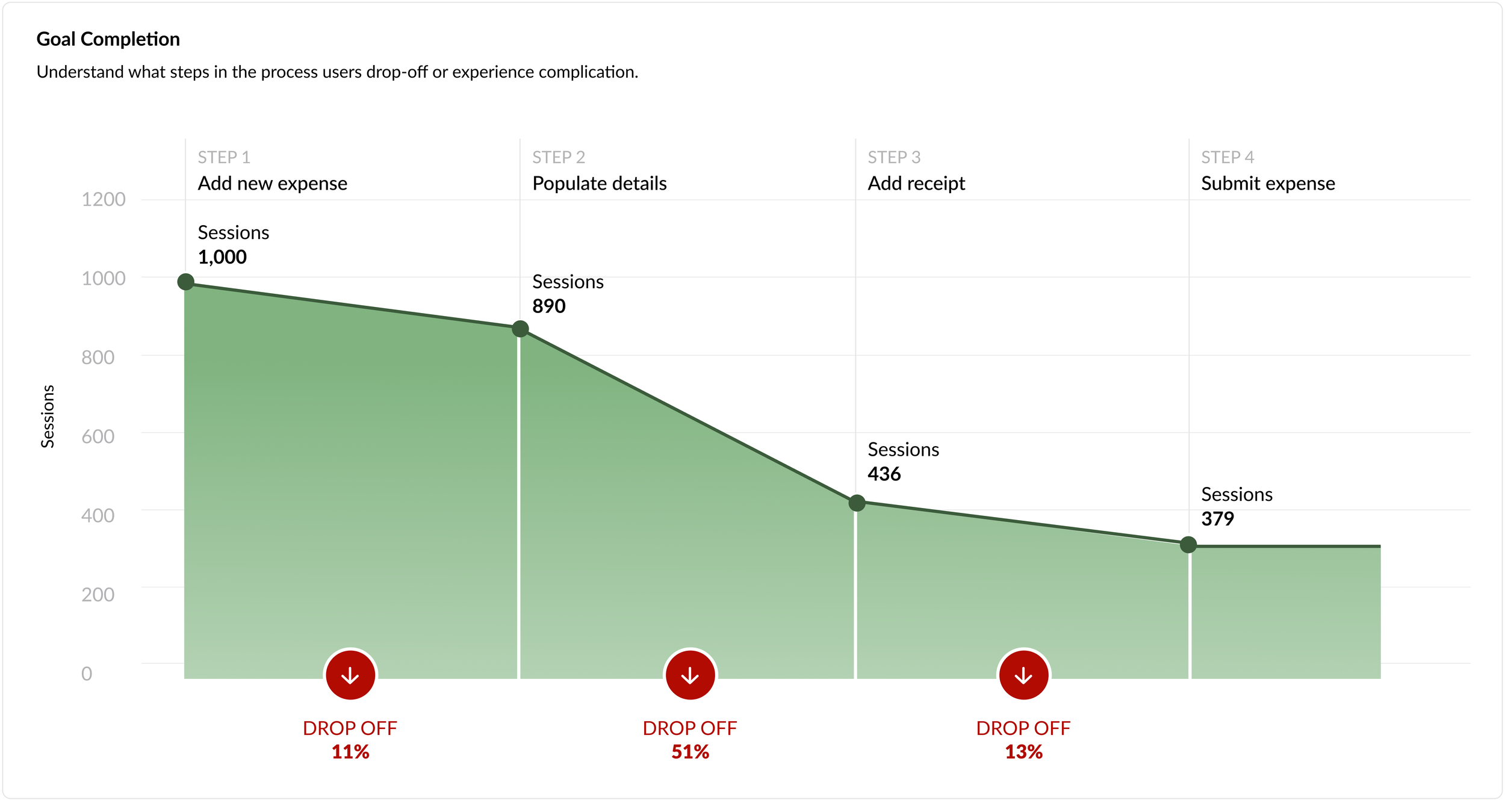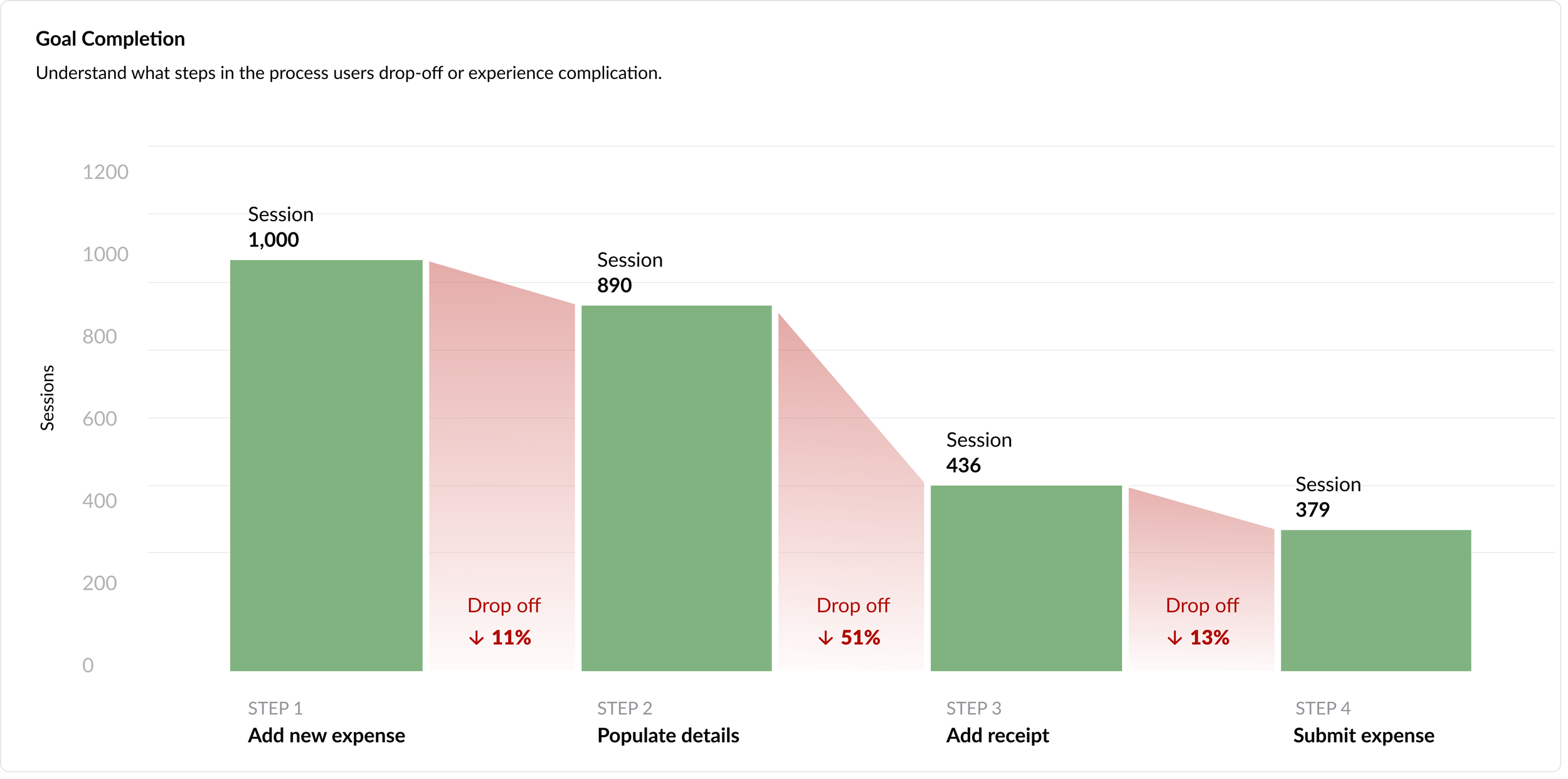 Instead of a repetitive table showing both completion and drop-off rates, I introduced a bar graph of session counts across each step. This visualization makes it easier to identify where drop-offs occur and highlights the specific steps with the most friction, giving users a clearer path to improvement.