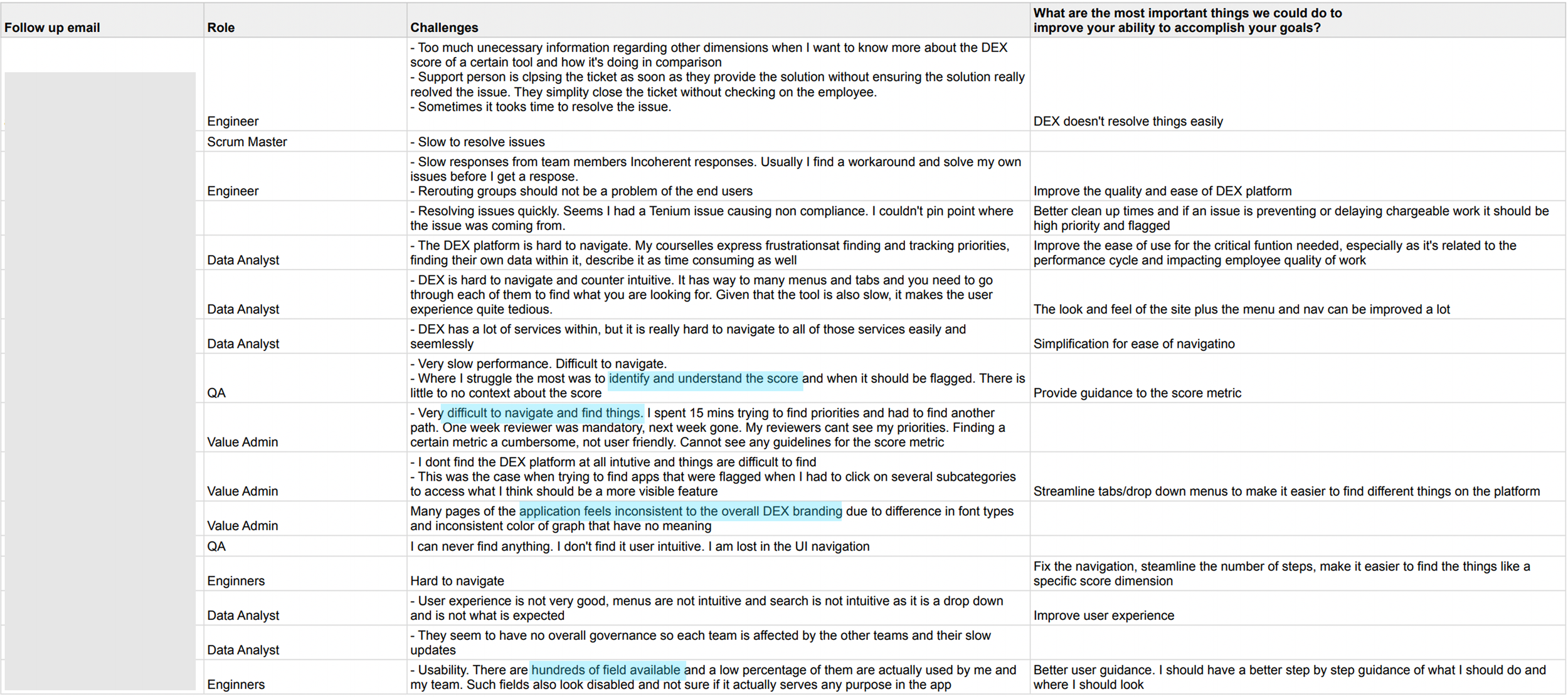 Our primary users are Accenture teams responsible for developing and maintaining internal employee applications. They rely on the DEX platform to monitor, measure, and improve the performance of the apps they support. Our team interviewed 30+ teams across Accenture who utilize the DEX platform (engineers, designers, data analysts, testers, and value admin).